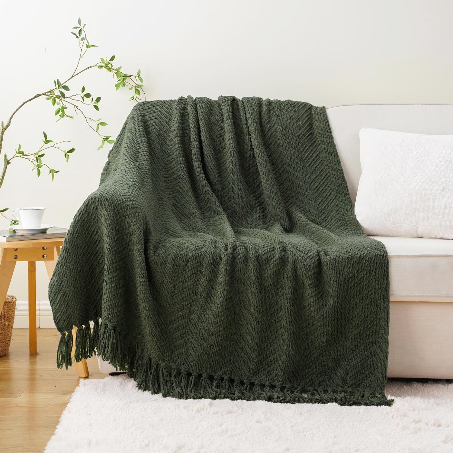 Dark Green Chenille Throw Blanket - 50"X60" Soft Cozy Knit with Fringe, Lightweight for Couch & Spring Decor