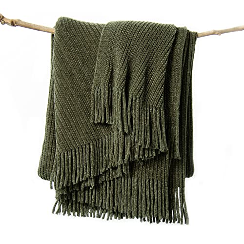 lifein Fall Green Throw Blanket for Couch-Soft Chenille Boho Throw,Knit Farmhouse Blanket,Cozy Knitted Small Lightweight Blanket&Throw with Tassel for Bed,Chair,Sofa,Home Decor(Olive Green,50 * 60in)
