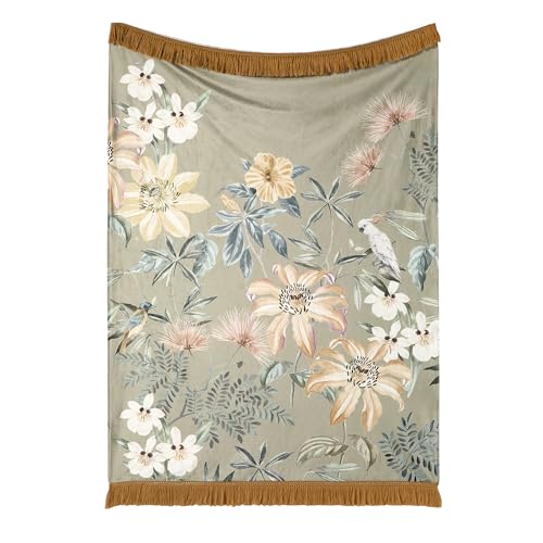 SOIREE - Sage Green Floral Throw Blanket (130 x 180cm) - Botanical Velvet Throw Blanket in Sage Green - Tassel Throw Blanket for Living Room/Bedroom - Luxury Bedding Matching Bedding Available