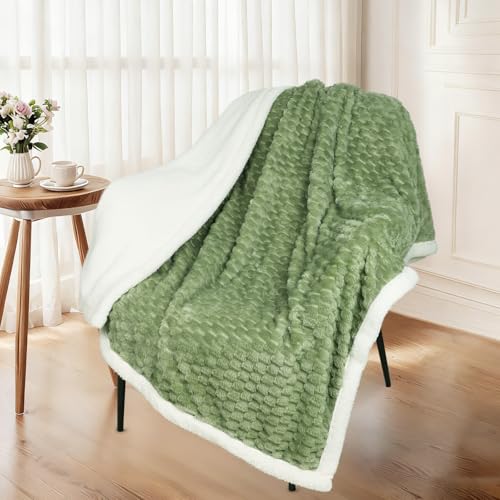 Famibay Throws for Sofas Sage Green Throw Blanket 130x150cm Fluffy Bed Throw Single Thick Soft Fleece Blanket 3D Jacquard for Sofa Bed Couch Chair