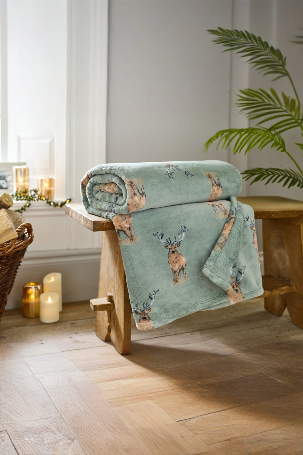 The Lyndon Company Highland Stag Decorative Throw – Green Soft Blanket 140 x 180cm Fleece - Size 140 cm x 180 cm