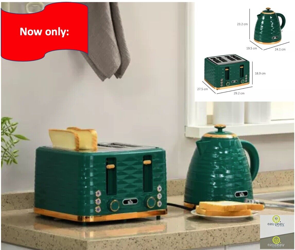 Kettle Toaster Set 1.7L Rapid Boil Kettle 4 Slice Toaster Green Gloss Finish