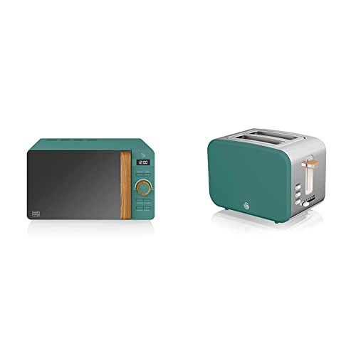 Swan 20L Nordic Digital LED Microwave, 6 Power Levels, SM22036LGREN & Nordic 2 Slice Toaster, Green, 900W, Soft Touch and Matte Finish, 6 Browning Levels, ST14610GREN