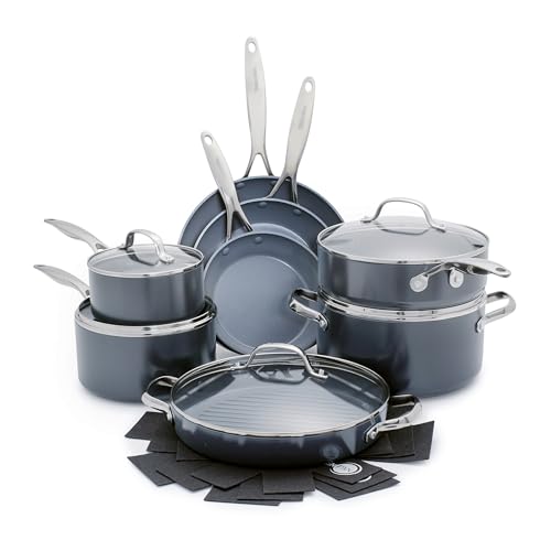 GreenPan Valencia Pro Hard Anodised Healthy Cearmic Non-Stick 16-Piece Cookware Set, Pots and Pan Set, Includes Frying Pans, Sauté, Sauce, Grill Pan, PFAS-Free, Induction, Oven Safe, Grey