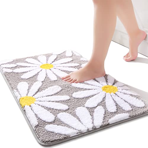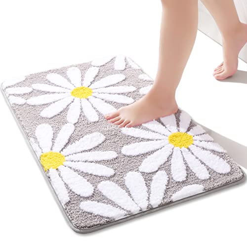 QJHOMO Grey Bath Mat White Flower Rug 40 x 60 cm, Non Slip Bath Mats for Bathroom, Soft Microfiber Bathroom Mat, Machine Washable Rug Durable Bathmat, Super Absorbent Floor Mat for Shower