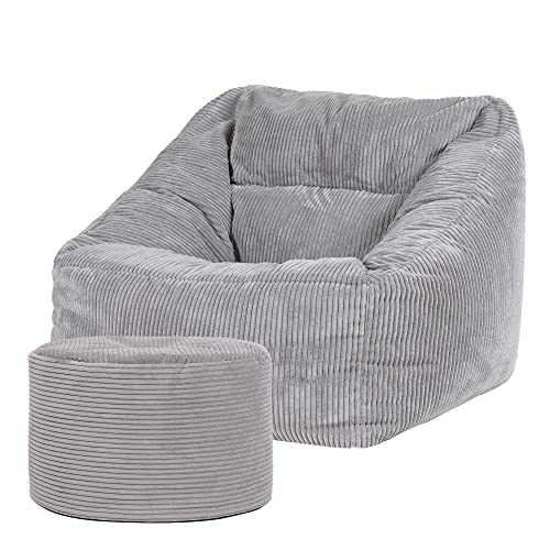 icon Natalia Cord Bean Bag Chair with Footstool, Grey, Large Adult Bean Bag with Filling Included, Comfy Chair, Armchair, Living Room, Living Room Furniture, Bedroom Furniture