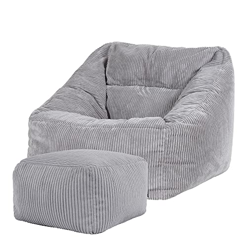 PatchHome Deluxe Cord Bean Bag Lounge Chair - Gaming Bean Bag Set with Footstool - Comfortable Cord Chair with Filling - Living Room & Bedroom Furniture (Grey, XL - Bean Bag + Stool Set)