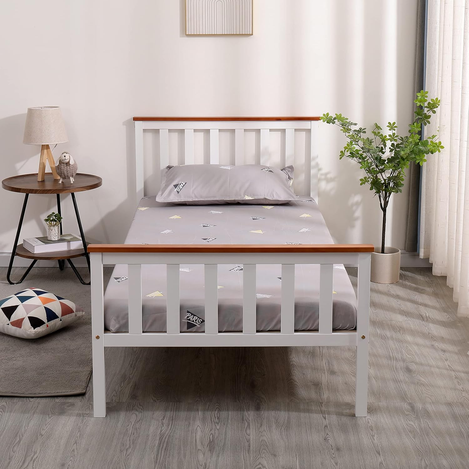 Owoxanthellate Single Bed Frame Solid Pine Wood 120x200 cm Modern Grey Headboard Bedroom Furniture Easy Assembly for Adults Teens Guest Room