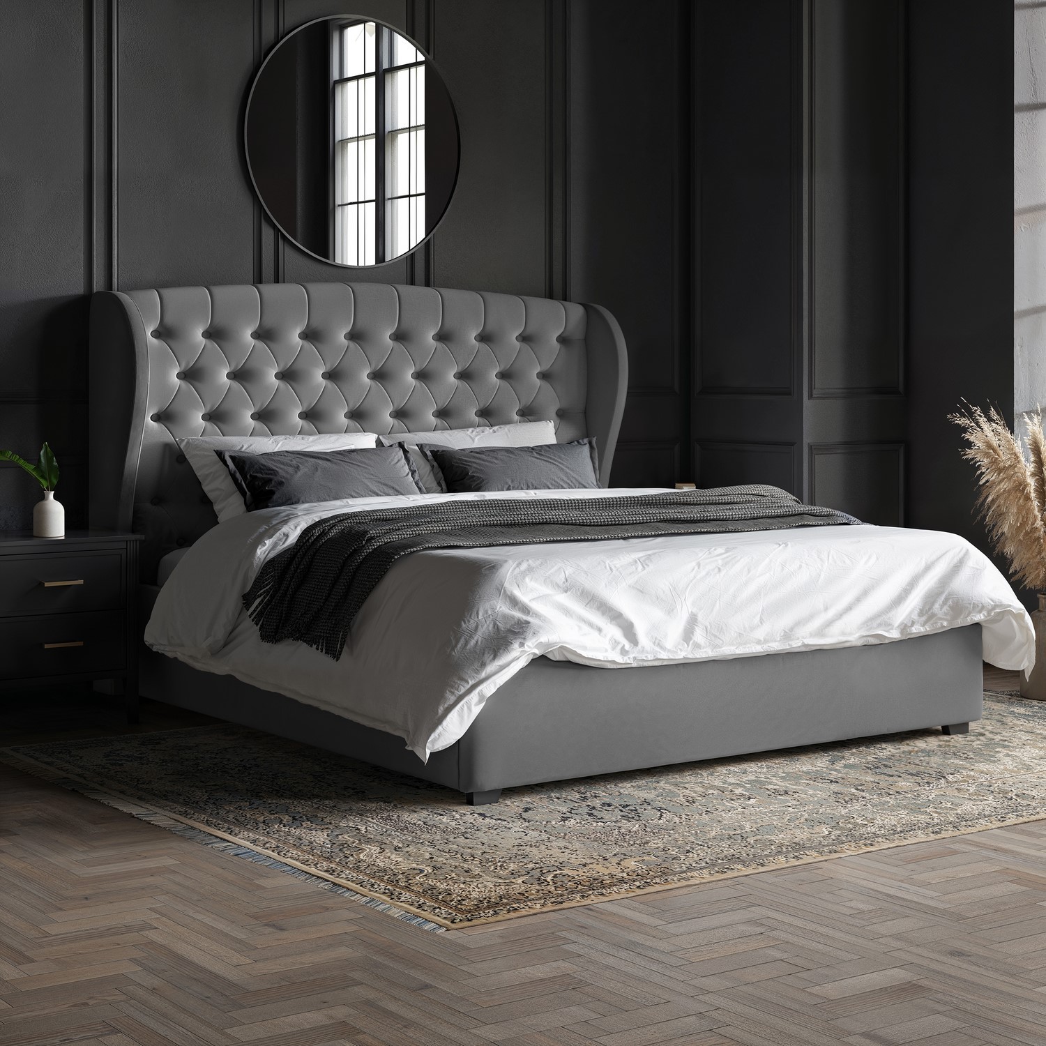 New Modern Safina Wing Back King Size Ottoman Bed/Grey Velvet Bedroom Furniture