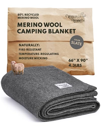 Woolly Mammoth Woolen Company Merino Wool Travel Blanket - 66 x 90 In, Grey - Picnic Blanket with Heavyweight Insulation for Camping Essentials