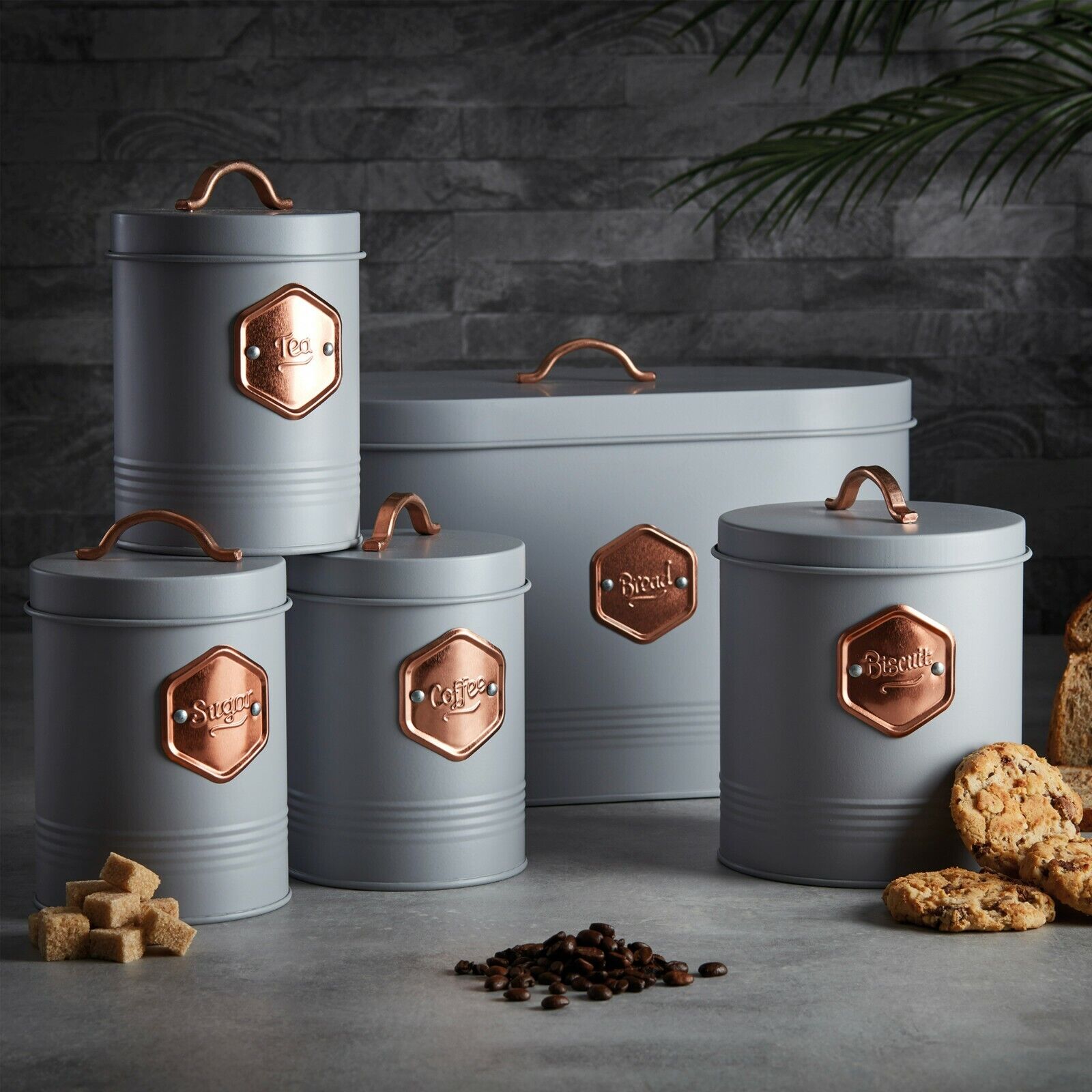 Kitchen Storage Canister Jar Set Bread Bin Biscuit Sugar Tea Coffee Grey Brass