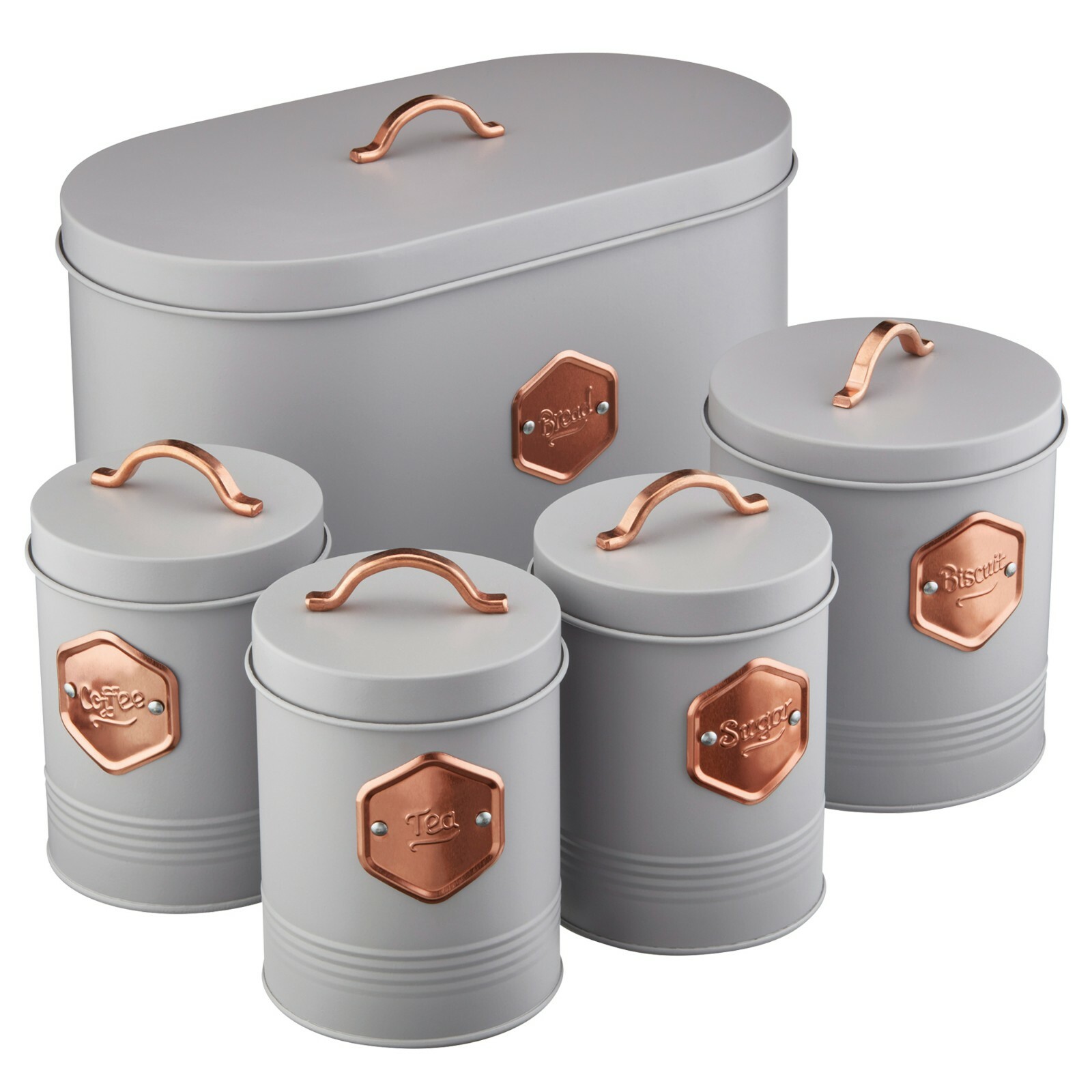 Cooks Professional 5-Piece Kitchen Storage Set Grey/Copper - Bread Bin, Biscuit Tin & Tea, Coffee Sugar Canisters with Copper Labels