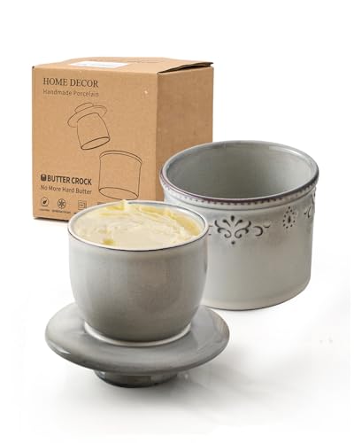 HOME DECOR Reactive Glaze Butter Crock with Lid,French Relief Butter Dish with Water Line,Butter Keeper for Fresh Spreadable Butter-Flecked Grey
