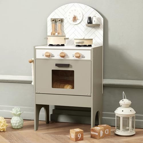 Hooga Toy Kitchen, Wooden Play Kitchen With Realistic Oven, Tea Towel Rail, Clock and Salt Pepper Pots, Kitchen Playset With Utensils and Interactive Dials (Grey)