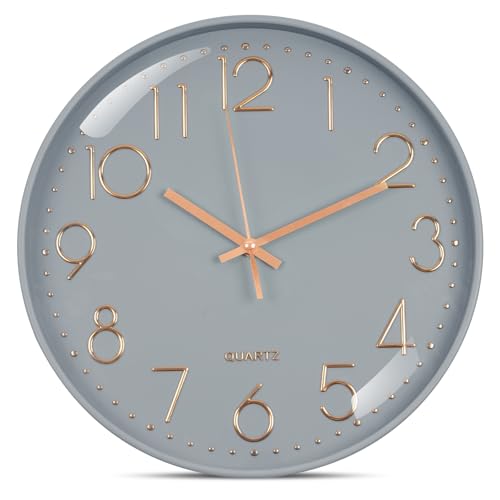 Joejis 30cm Kitchen Wall Clocks, Silent Wall Clock Non-Ticking Sweep Mechanism - Modern Quartz Design Decorative Bathroom Living Room Hallway - Grey and Rose Gold