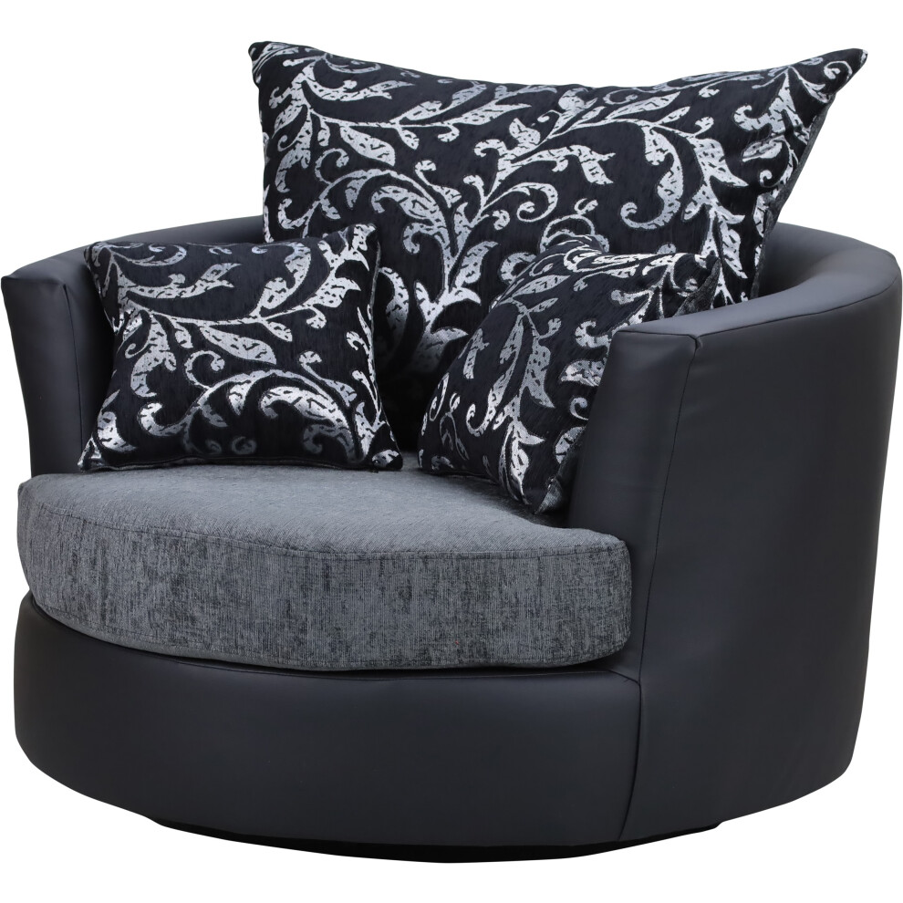 Sofas and More Large Swivel Round Cuddle Chair Fabric Chenille Leather Designer Scatter Cushions (Black/grey)