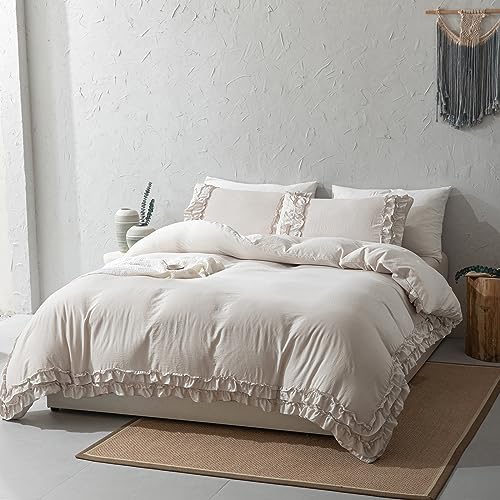 Herside Beige Grey Duvet Cover Set King Ruffle Bedding Chic 2-Layers Cute Ruffled Design Boho Farmhouse Bedding Sets 1 Duvet Cover 2 Pillowcases (Beige, King)