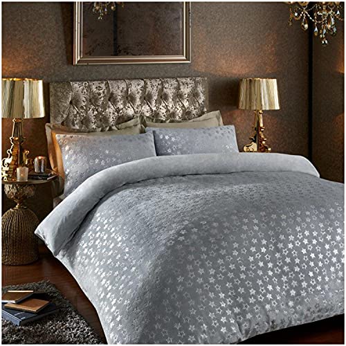 GC GAVENO CAVAILIA Teddy Fleece Star Foil Fitted Sheet, Super Soft Fluffy Cosy Warm Shiny Bedding & Bedsheet, 2 Piece Easy Care DuvetCover & Deep Elastic Band Bedlinen, Grey, King Duvet Set