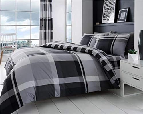Homemaker ® Grey duvet set wide tartan check squares quilt cover & pillow cases (Double)
