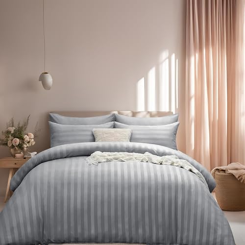 J.Din Light Grey Duvet Cover Set - Hotel Quality Satin Striped Reversible Bedding - Super King Size Bed Set with Pillowcase - Soft Brushed Microfiber Quilt Cover