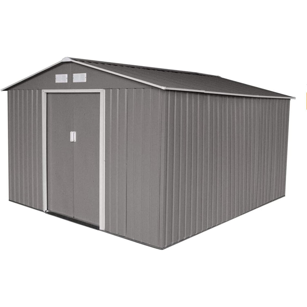 (10X8FT, Grey) BIRCHTREE Outdoor Garden Shed Steel Apex Roof Tool With Doors Window Foundation