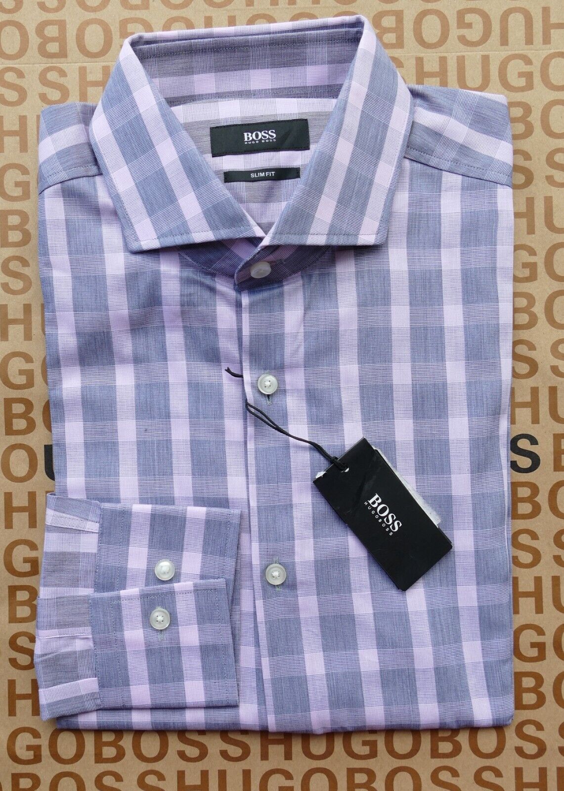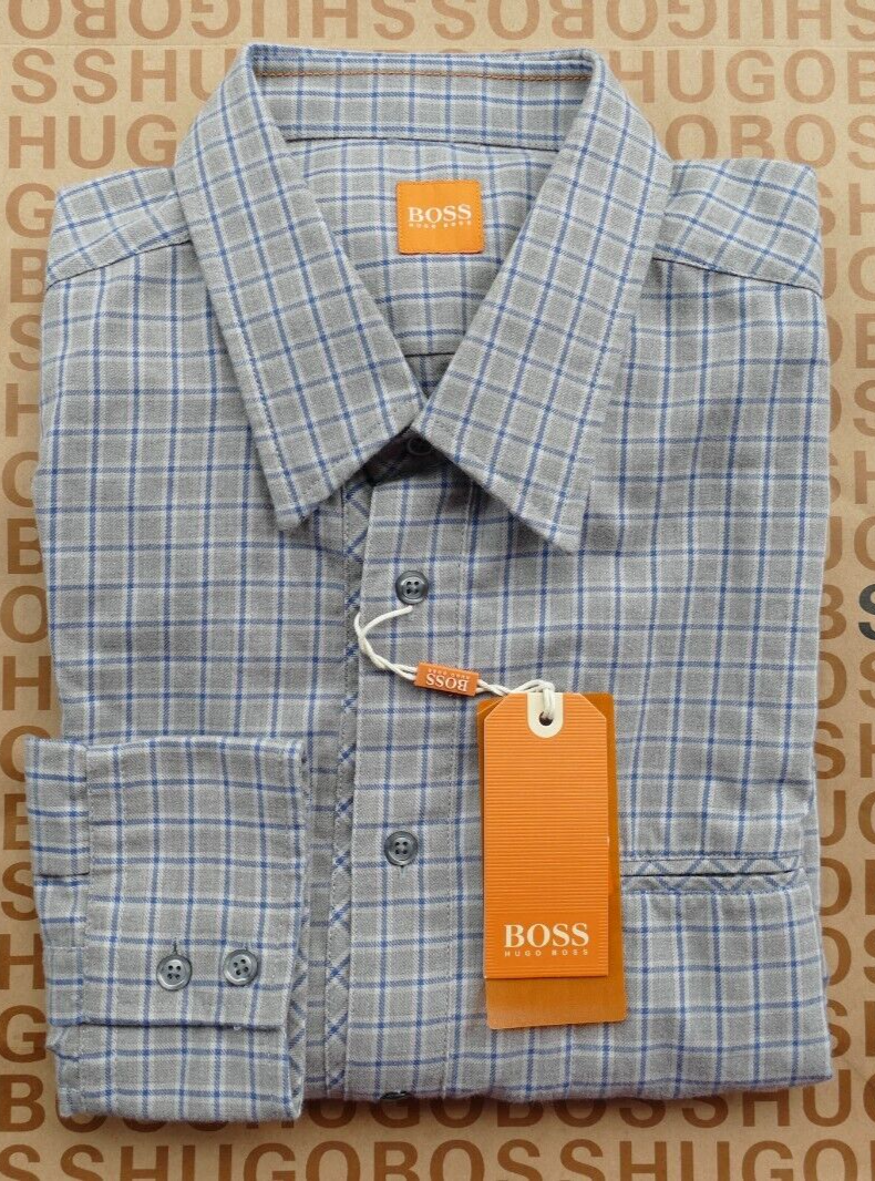 New Hugo BOSS mens grey long sleeve slim casual smart suit checked shirt LARGE