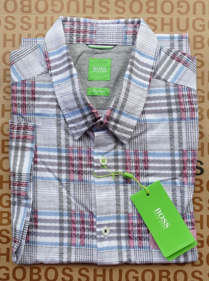 New Hugo BOSS mens grey checked regular fit cotton smart casual suit shirt XL