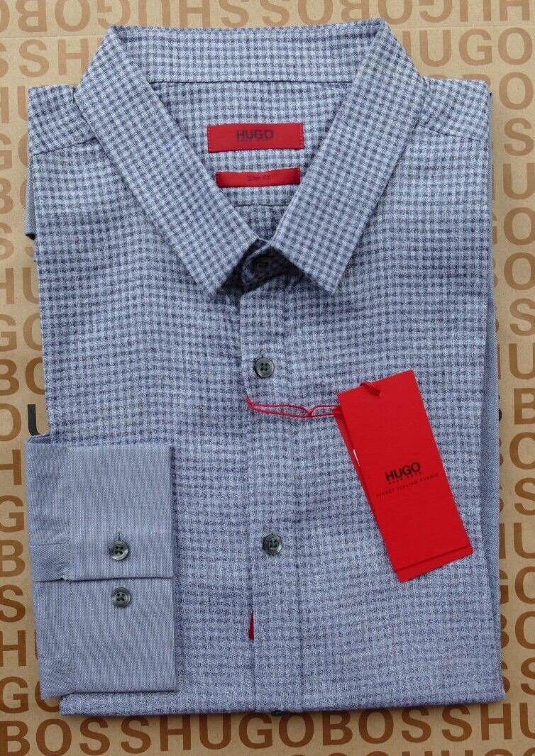 New Hugo BOSS mens grey checked slim Italian fabric smart casual suit shirt XL
