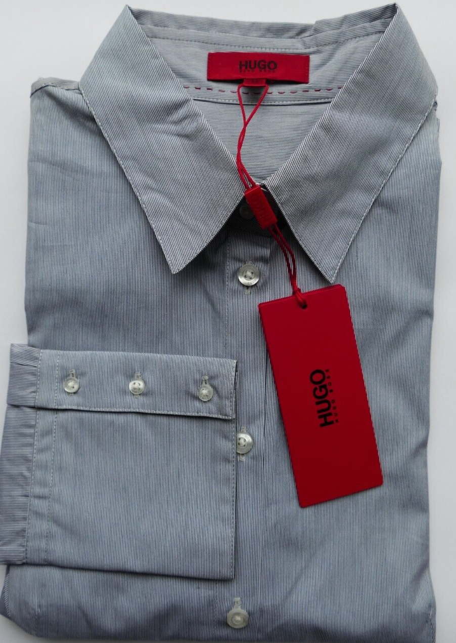 New Hugo BOSS men grey stripe slim fit long sleeve smart casual suit shirt SMALL