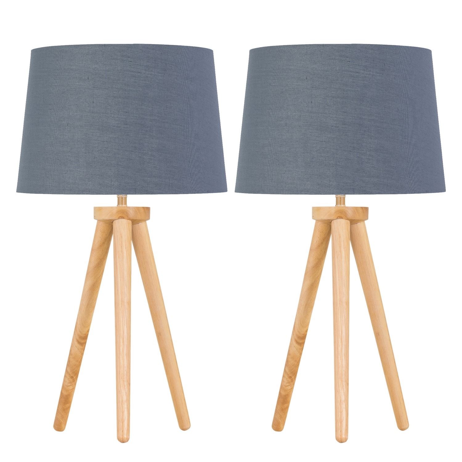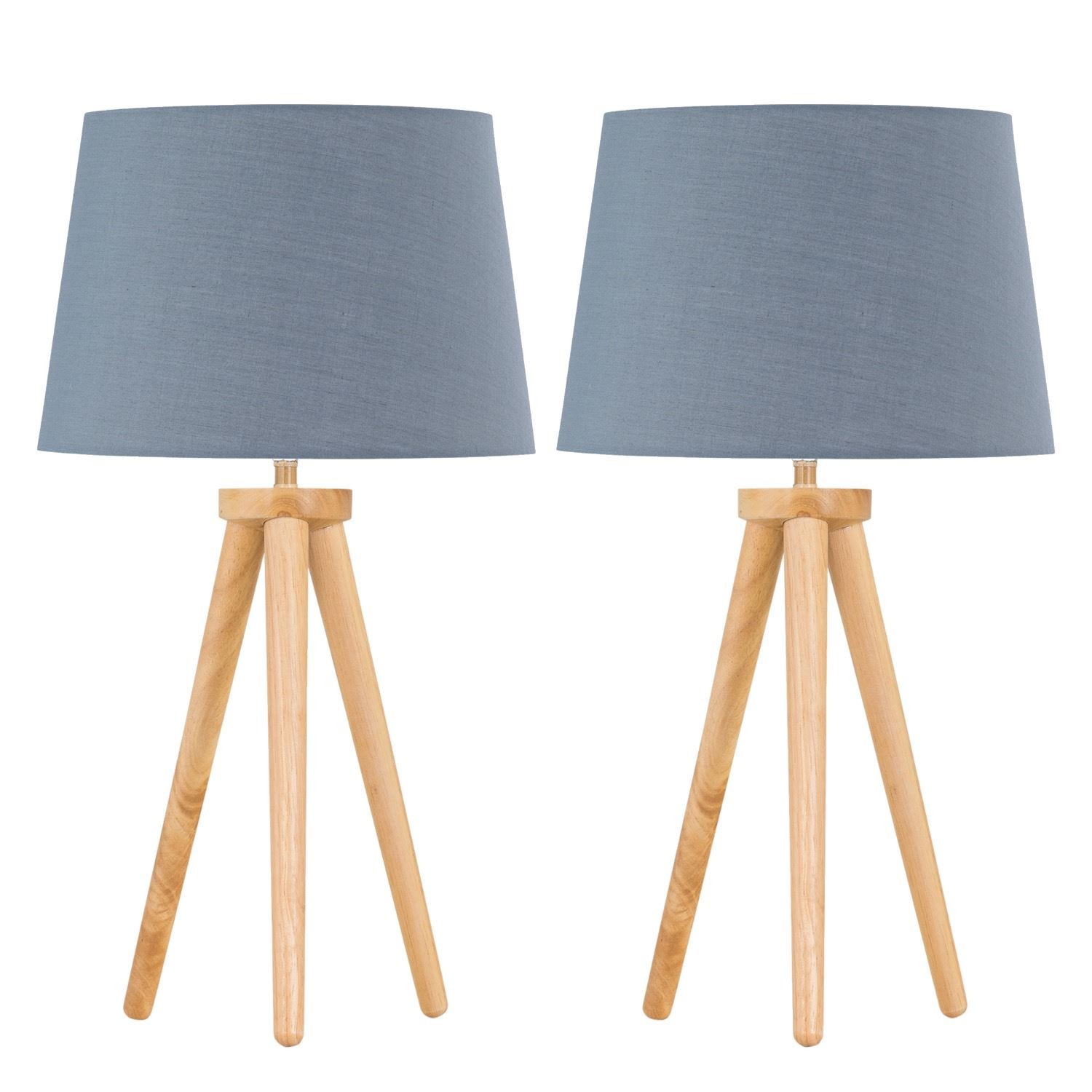 Set of 2 Modern Light Oak Table Lamp Bedside Lights Wood Tripod Grey Shades