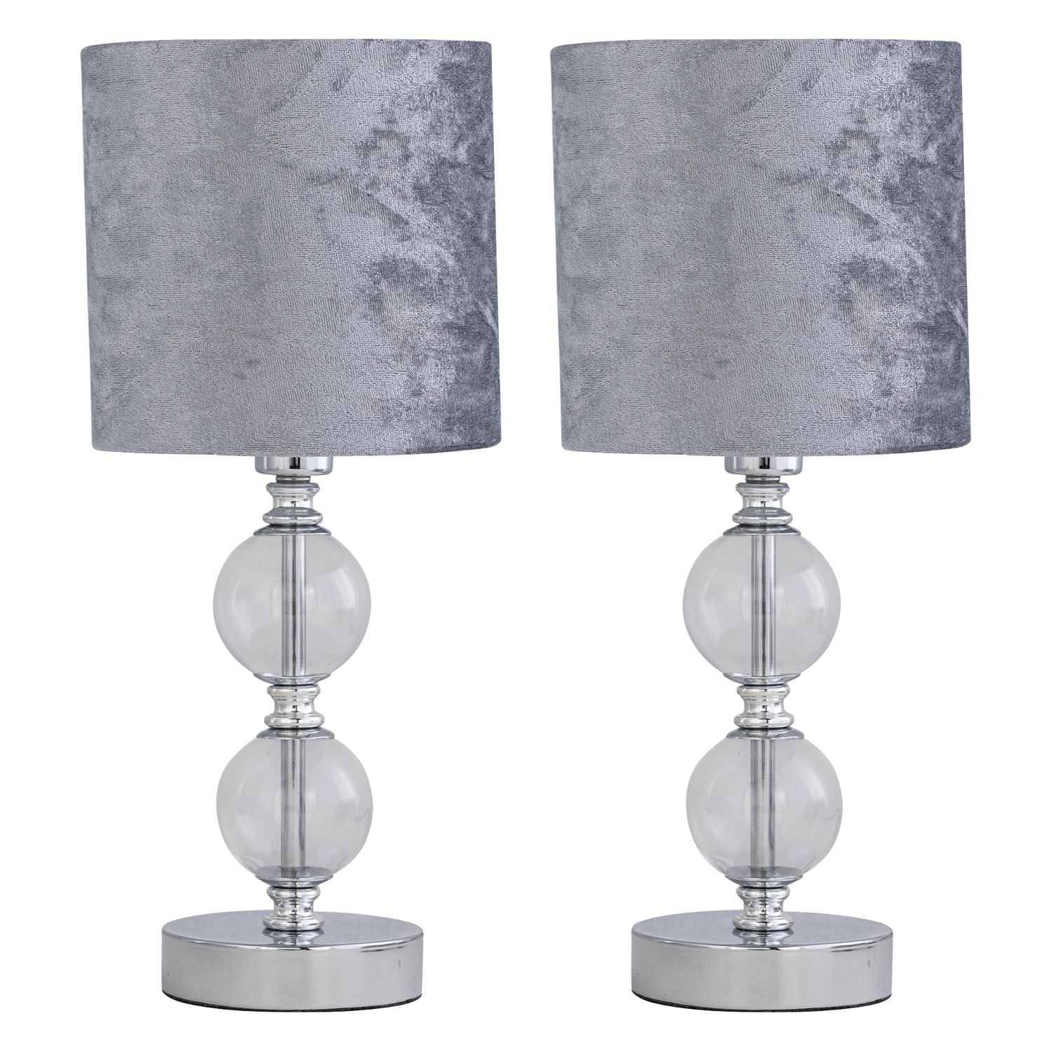Set of 2 Two Ball Table Lamp Bedside Light Grey Crushed Velvet Shades