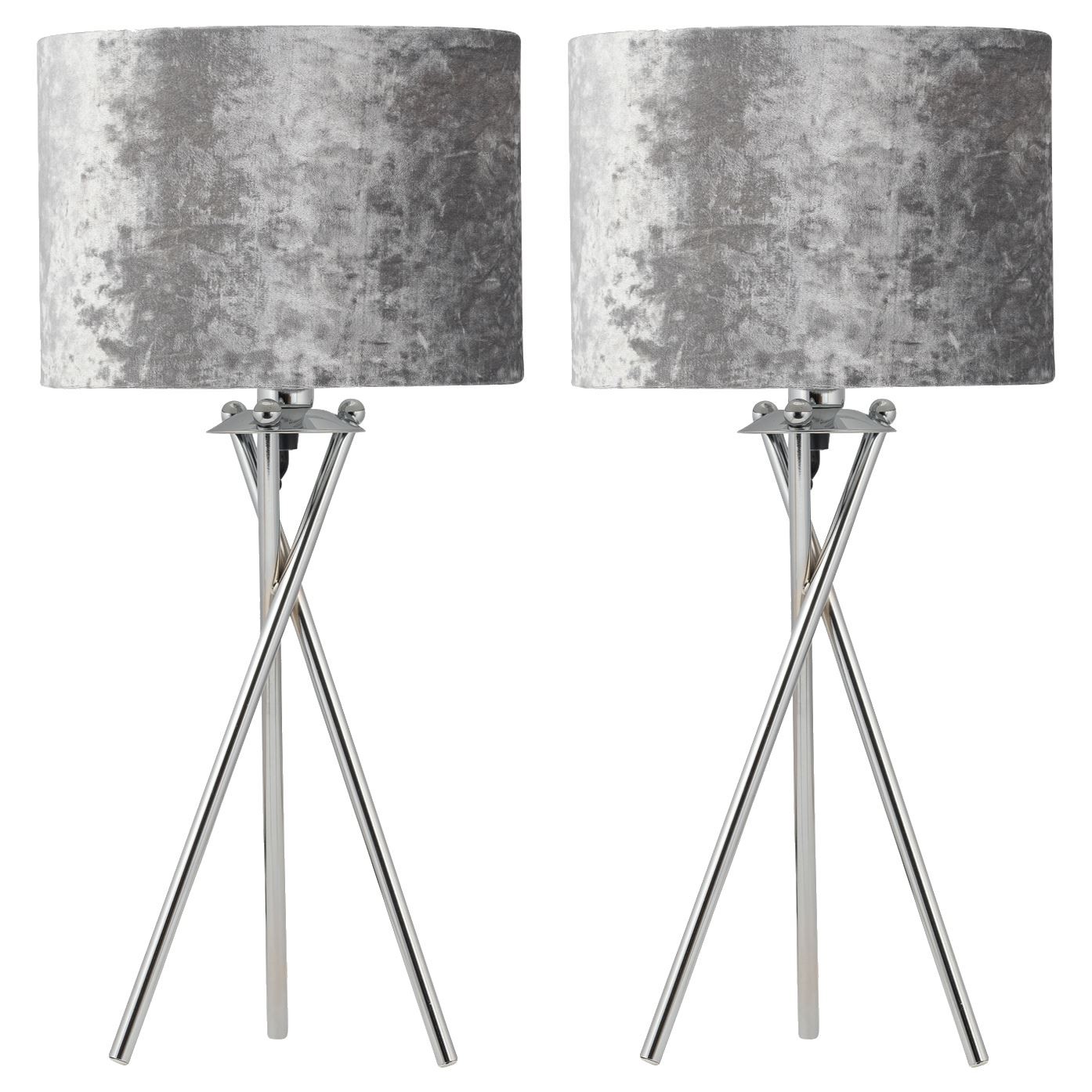 Set of 2 Chrome Tripod 52cm Table Lamp Bedside Lights Grey Crushed Velvet Shades