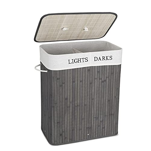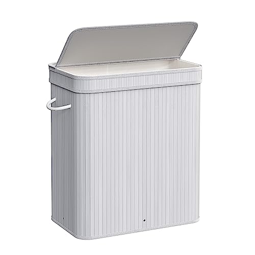 Mondeer Laundry Basket with Lid 100L, 2 Compartments Bamboo Laundry Hamper with Handles Removable Washable Lining, Foldable, for Bedroom Bathroom or Utility Room, 52 x 32 x 65 cm, Grey