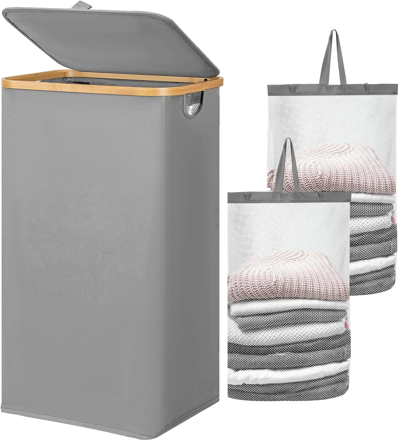 Lifewit 100L Laundry Basket with Lid, Clothes Hampers for Laundry with Bamboo Handles and A Removable Laundry Bag, Large Foldable Laundry Hamper for Bedroom, Bathroom, Dorm, Laundry Room, Grey