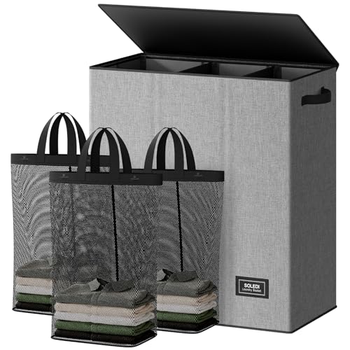 SOLEDI Laundry Basket 3 Section 160L Laundry Hamper with Lid Clothes Hamper Collapsible Washing Basket Bag, Foldable Washing Bin for Bedroom, Laundry room, Livingroom (Grey)