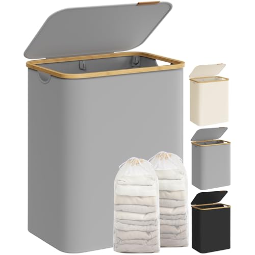 Lifewit 80L Laundry Basket with Lid, Clothes Hampers for Laundry with Bamboo Handles and Removable Laundry Bags, Large Foldable Laundry Hamper for Bedroom, Bathroom, Dorm,Laundry Room, Light Grey