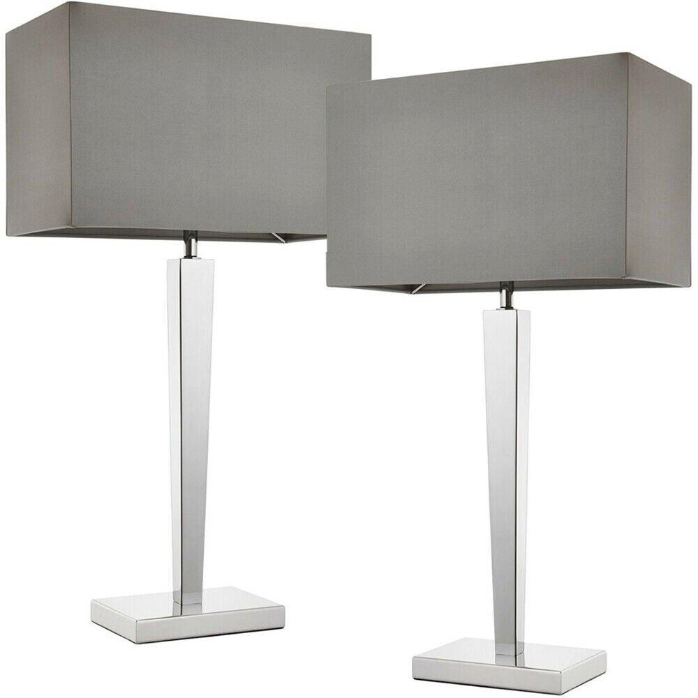 2 PACK Rectangular Table Lamp Light Modern Chrome & Grey Shade Sleek Sideboard