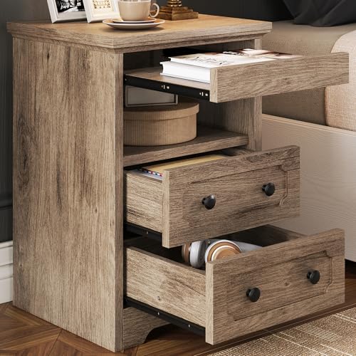 COWMOU Nightstand with Drawers 3 Drawer Night Stand with Charging Station Farmhouse Style Large Bed Side Table Wooden Dresser for Bedroom Living Room (1, Grey Grain)