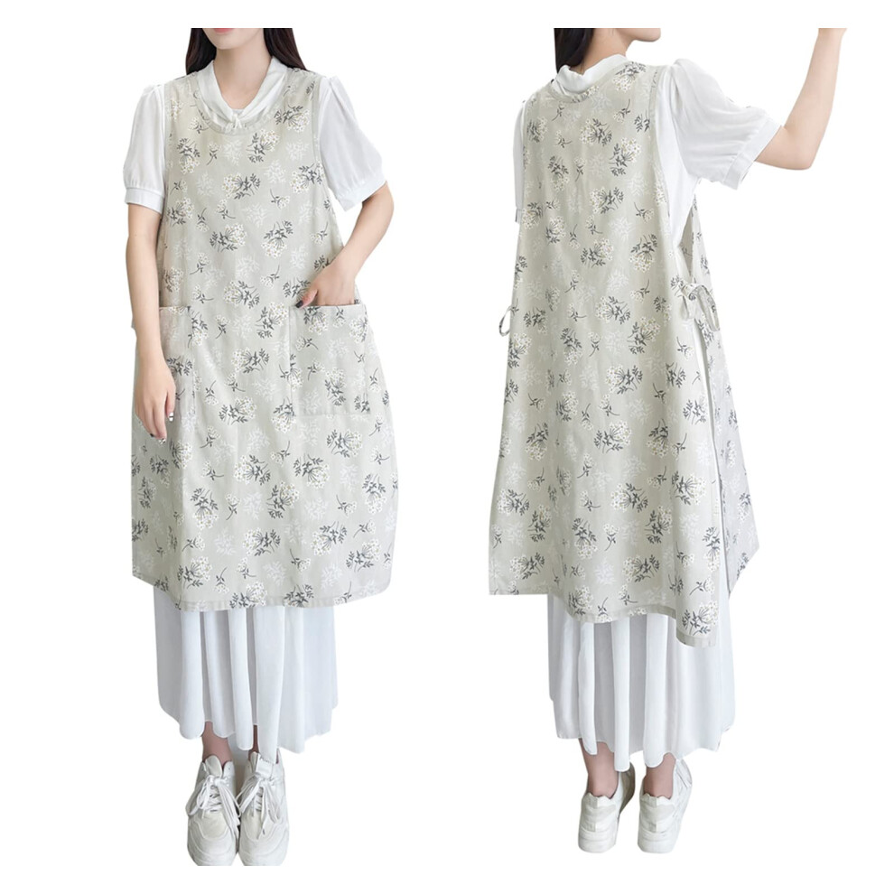 (Grey, M) Cotton Linen Apron Cross Back Apron For Women With Pockets Pinafore Dress For Baking Cooking