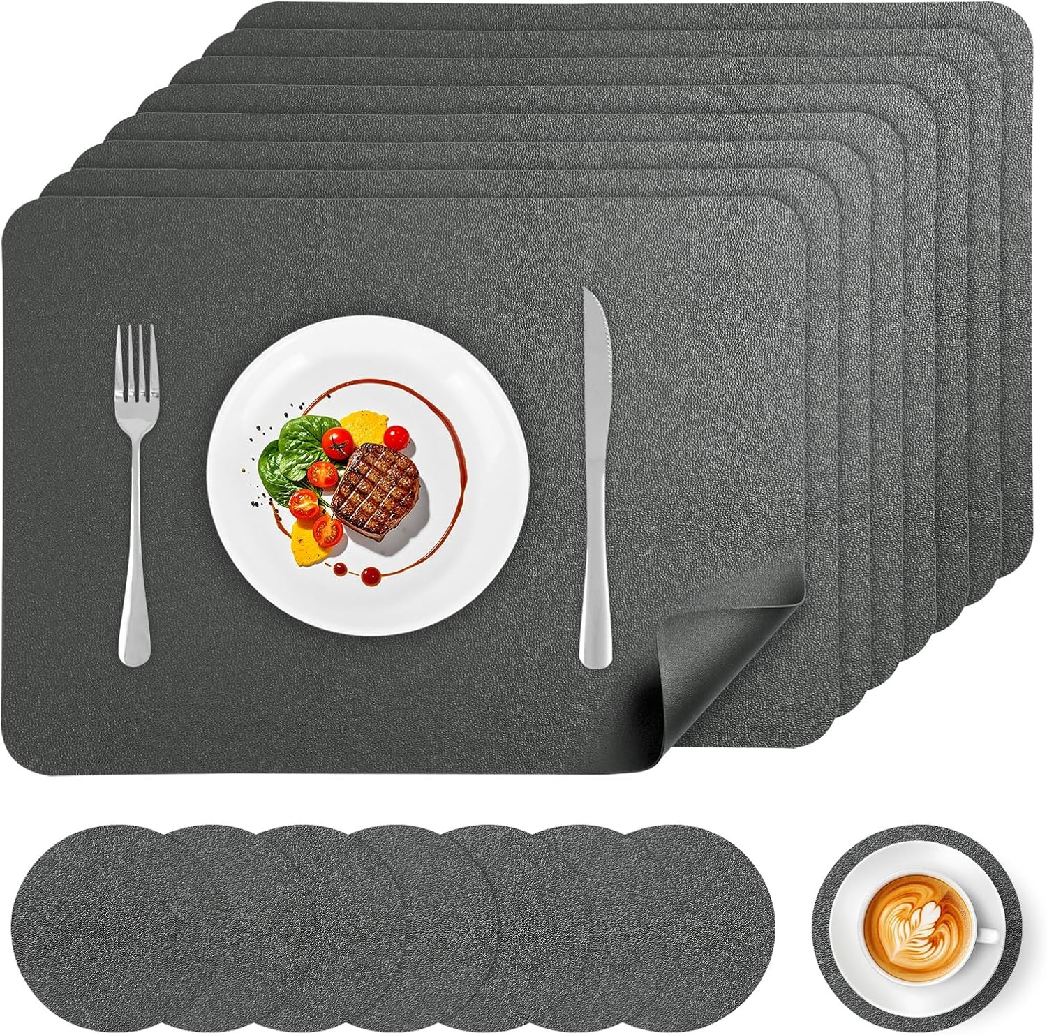 APLKER Grey Placemats and Coaster Sets 8, Faux Leather Waterproof Table Mats 16.
