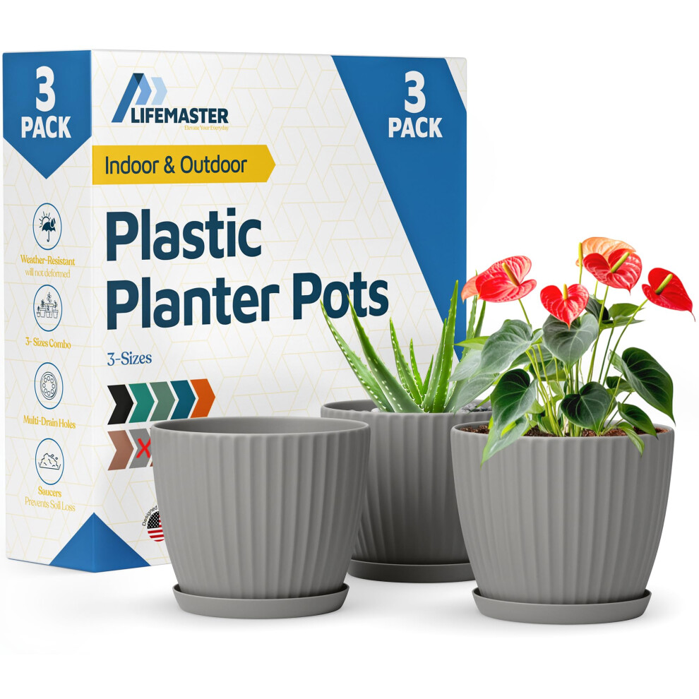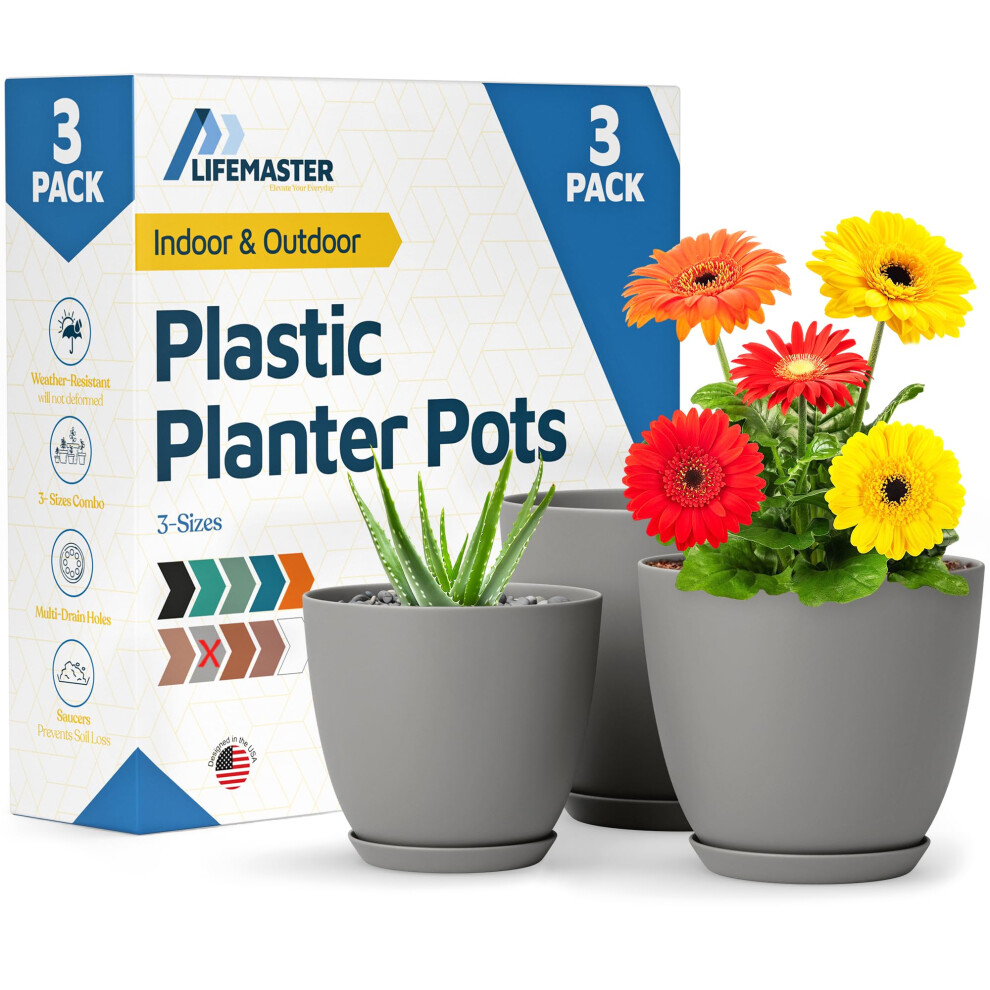 Gray Plant Pots with Drainage Holes & Saucers 3 Packs, Indoor & Outdoor Stackable Plastic Planters in Multiple Sizes for Houseplants & Flowers, Durabl