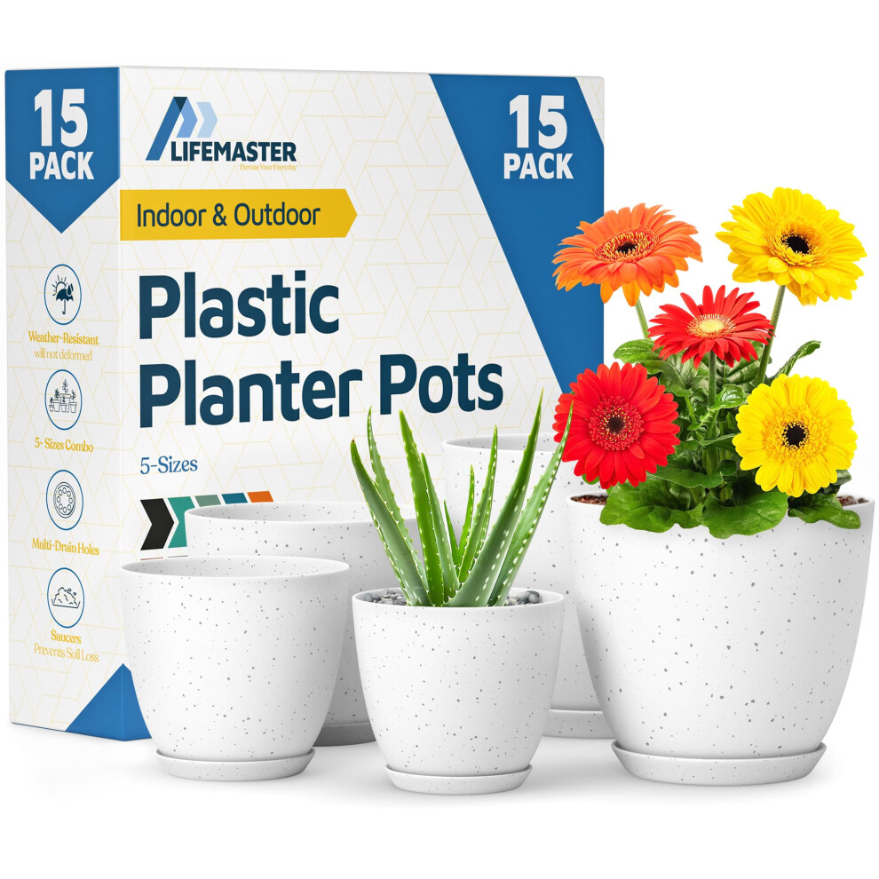 White+Surface Gray Plant Pots with Drainage Holes & Saucers 15 Packs, Indoor & Outdoor Stackable Plastic Planters in Multiple Sizes for Houseplants &