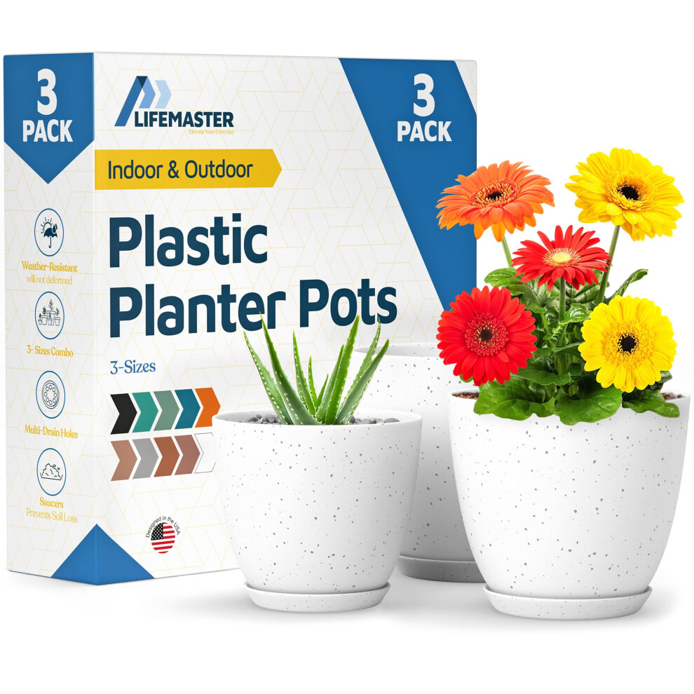 White+Surface Gray Plant Pots with Drainage Holes & Saucers 3 Packs, Indoor & Outdoor Stackable Plastic Planters in Multiple Sizes for Houseplants & F