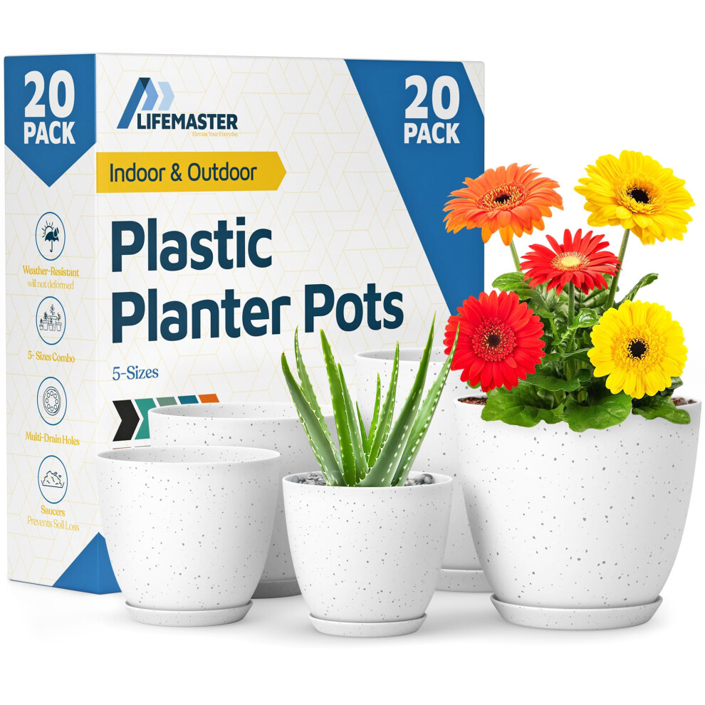 White+Surface Gray Plant Pots with Drainage Holes & Saucers 20 Packs, Indoor & Outdoor Stackable Plastic Planters in Multiple Sizes for Houseplants &