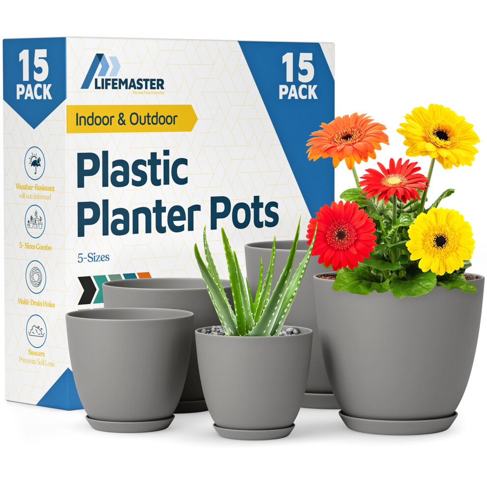 Gray Plant Pots with Drainage Holes & Saucers 15 Packs, Indoor & Outdoor Stackable Plastic Planters in Multiple Sizes for Houseplants & Flowers, Durab