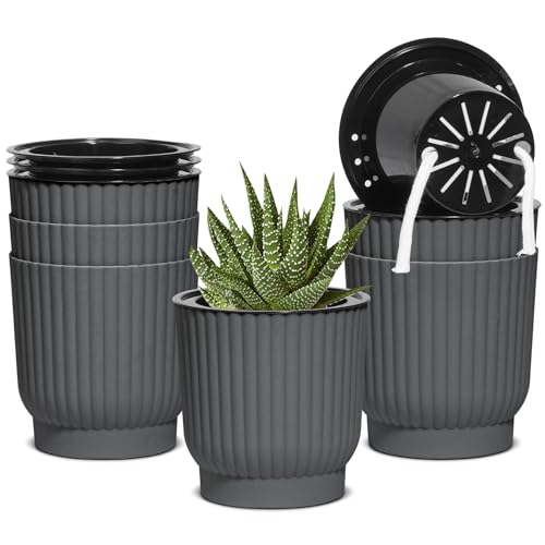 T4U 6 Inch Self Watering Pots 6 Pack, Plastic Plant Pots with Holder, Windowsill Flowers Pots for All Indoor Outdoor Plants, African Violets (Grey)