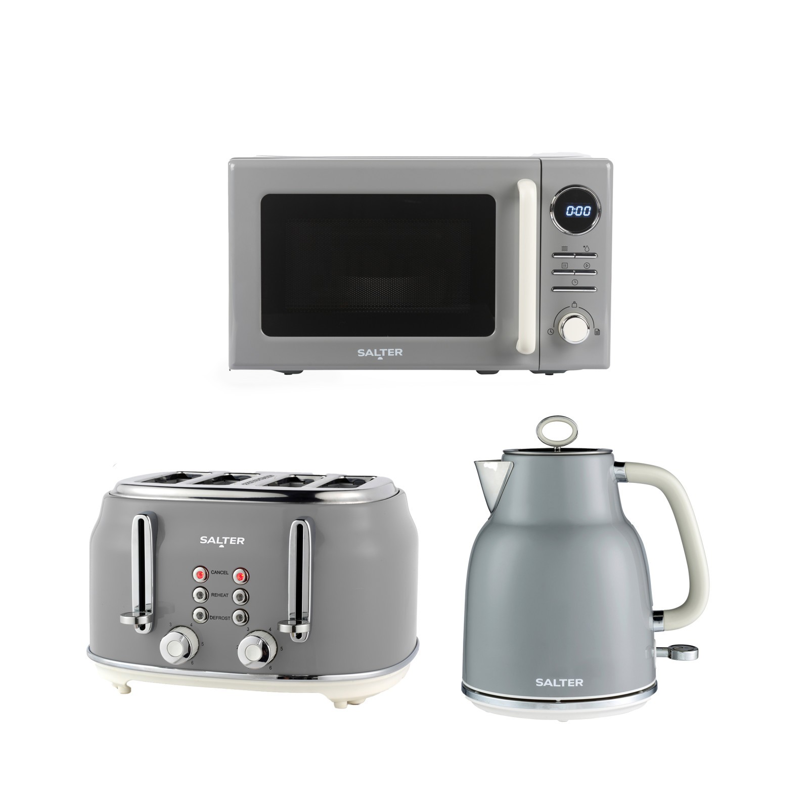 Salter Retro Grey Rapid Boil Kettle, 4 Slice Toaster & Digital Microwave Set