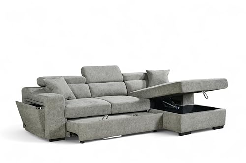 DAKO® Modern Grey Corner Sofa Bed HAMLET BIS with Storage & Adjustable Cushions – L-Shaped Convertible Sleeper Sofa with Chaise – Stylish Fabric Upholstery(Grey/Beige)