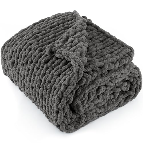 LONG CREATE Chunky Knit Throw Blanket 50"X 60", 100% Handmade with Soft Chenille Yarn, 4.4lbs Thick Cable Knitted Blankets, Large Rope Knot Crochet Throws for Couch Sofa Bed Home Decor, Dark Grey