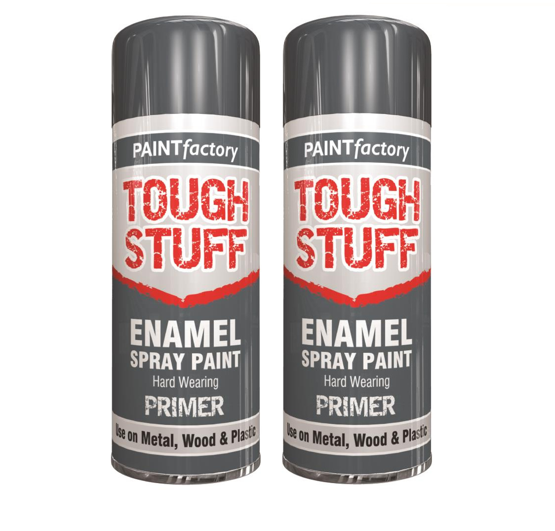 2x NEW TOUGH STUFF ENAMEL GREY PRIMER SPRAY PAINT FOR WOOD METAL PLASTIC 400ML